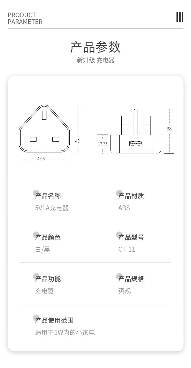 5V1A英规适配器充电器电子产品3c数码充电头usb口插座手机充电器
