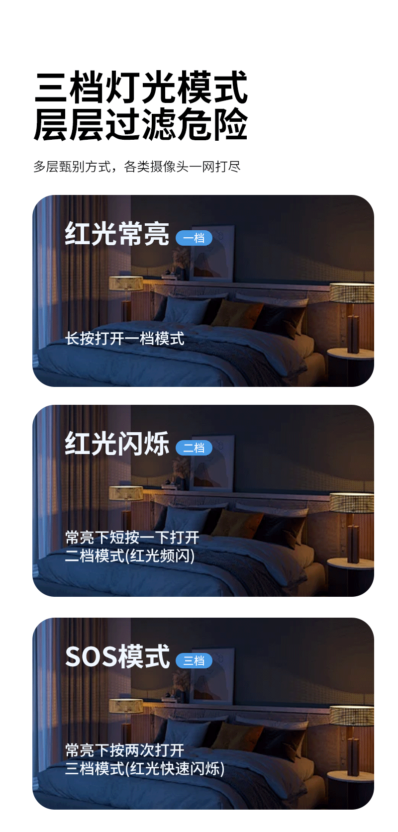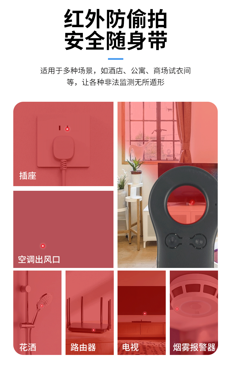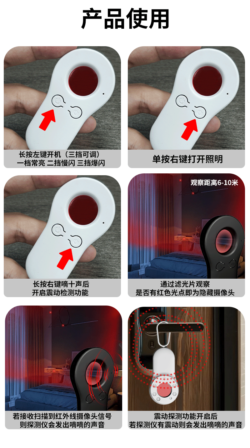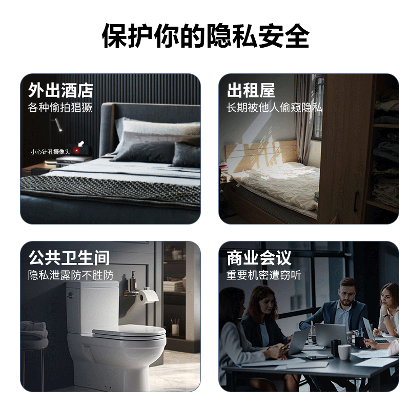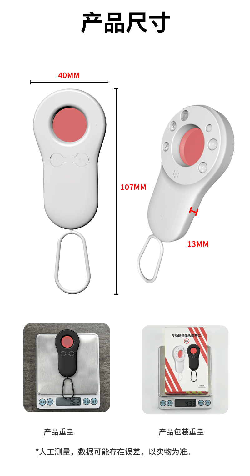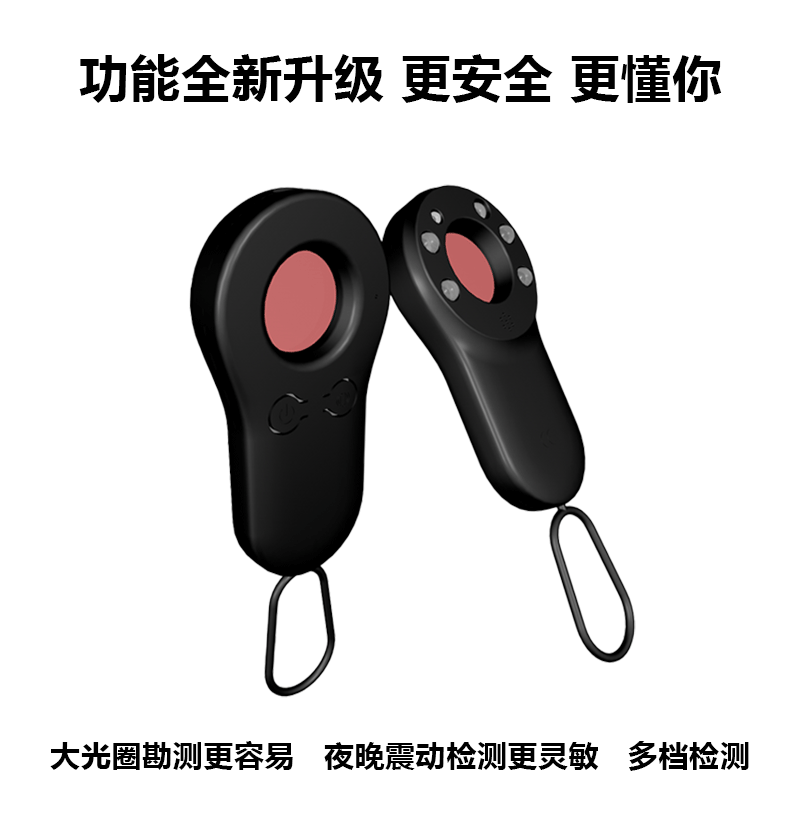 产品特点:新品上线,顶配版摄像头探测仪,红外线扫描探测报警,感应式震动报警!出旅行旅馆酒店、公共场所、厕所、试衣间等,防偷拍摄像头探测仪,各类摄像头都可以一网打尽,不同场合的各类偷拍都能检测;超长待机,守护不间断,支持Type-C快速充电;掌心小方块,安全随身带,轻盈小巧,附带挂绳,随身保护你的隐私安全,支持礼品定制logo,大量现货,欢迎新老客户下单!