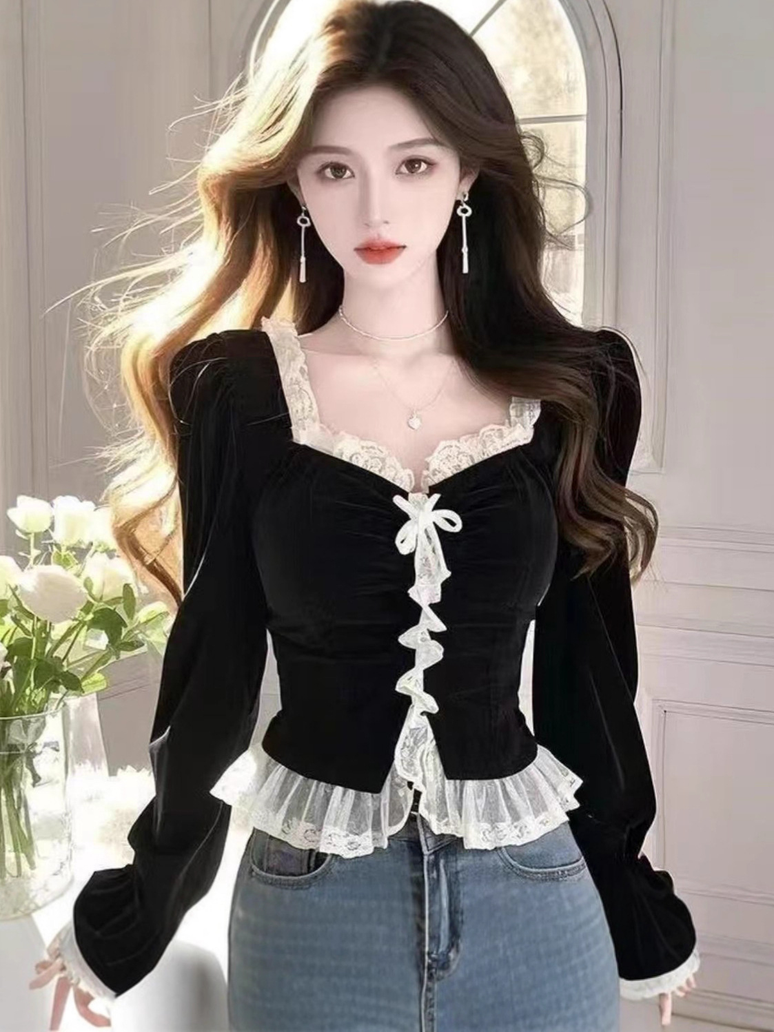 Purely Sensual, Sexy and Fashionable New Black Velvet Stylish Lace-Trimmed Square-Neck Patchwork Long-Sleeve Base Shirt for Women